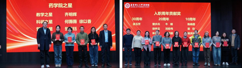 会上,学院党政班子为“药学院之星”获奖教师进行颁奖,齐明辉老师积极开展课程建设工作,负责的《质量文化导论》课程入选第三批国家级一流本科课程,荣获“教学之星”;何薇薇老师在化学生物学领域开展前沿研究,取得系列成果,并将研究深度融入教育部“101计划”核心教材编写,将前沿成果有效转化为教学资源与人才培养实践;徐以香老师积极开展原创靶标发现与新药研发,已获得多个临床前候选化合物,并实现2项技术转让,双双荣获“科研之星”;张旻钰老师以青春之力育时代新人,在学院团学建设工作中形成特色做法,荣获“管理之星”。此外,班子成员还为在校贡献30周年、20周年、10周年的教职工颁发荣誉证书,感谢老师们长期以来以坚韧不拔之姿默默坚守,用精益求精之态倾心耕耘。最后,2025年新入职的老师们依次上台做自我介绍,并带来了精彩的节目表演。