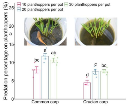 为进一步验证上述全球效应,万年峰课题组开展了连续4年的野外田间试验,研究证实:i)稻鱼共生区内的稻飞虱、螟虫、卷叶螟等主要害虫数量明显低于水稻单作区的,而捕食性蜘蛛数量则更高(图5);ii)养鱼后水稻千粒重和产量也增加(图6);iii)路径分析表明,稻鱼共生通过增加天敌数量来抑制害虫,进而实现间接增产效应(图7)。盆栽行为学实验进一步阐明机制:鲫鱼和红鲤鱼等鱼类偏好取食害虫(褐飞虱),而不捕食捕食性狼蛛(图8)。这意味着,鱼类在稻田中扮演着“精准调控者”的角色,既直接削减了害虫,又保护并强化了田间的天然“控害军团”,从而建立了一种高效的协同控害网络。
