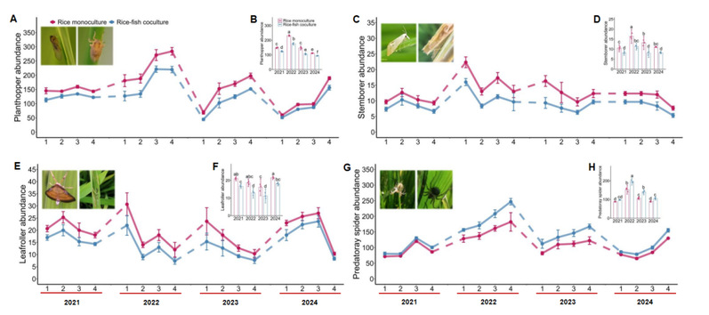 图5 四年野外试验证实:稻鱼共生模式抑制害虫和保育捕食性蜘蛛