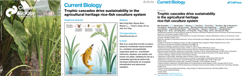 近日,我校药学院万年峰教授课题组,联合中、英、法、美、德、瑞士、丹麦、西班牙等国家的科研人员,在国际生物学著名期刊Cell子刊—Current Biology上以封面文章形式发表了题为“Trophic cascades drive sustainabilityin the agricultural heritagerice-fish coculture system”研究性论文。该研究为具有数千年历史的稻鱼共生模式(全球重要农业文化遗产)提供了坚实的科学依据。研究整合了全球18个国家的实验数据,并在中国东部开展了长期田间定位与行为学实验,系统证实了这一古老农艺不仅能增产,更能通过生态调控机制控制病虫害,为生态农业转型与保障粮食安全开辟了科学路径。