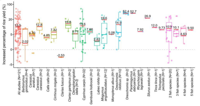 图2 不同鱼对水稻增产效应存在明显差异