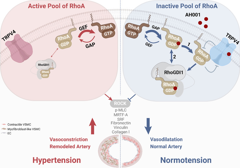 高血压已成为全球重大的公共卫生挑战,患病率持续攀升,且与多种心血管并发症密切相关。尽管目前临床已有五大类一线降压药(ACEI、ARB、β受体阻滞剂、CCB和利尿剂),但传统靶点分布广泛、机体代偿机制复杂,常引发药物副作用和耐药性问题,导致许多患者的血压控制效果难如人意。因此,开发更精准、安全的新靶点刻不容缓。 血压稳定的核心在于血管的“张弛有度”,这离不开血管平滑肌细胞(Vascular smooth muscle cell, VSMC)的精细调控。其中,瞬时受体电位香草酸4型通道(Transient receptor potential vanilloid 4, TRPV4)是一种广泛分布于动脉壁的非选择性阳离子通道,通过调控钙离子流动直接影响血管舒缩功能,在维持血压稳态中发挥关键作用。最新研究发现,Ras同源蛋白A(Ras homolog family member A, RhoA)可直接结合于TRPV4的ARD区域,将其锁定在关闭状态。然而,TRPV4-RhoA复合物在血管功能及高血压发生发展中的具体调控机制尚不明确。深入解析高血压状态下TRPV4-RhoA的相互作用模式及其动态调控规律,有望解锁新一代精准降压疗法的关键密码。 研究团队发现候选药物AH001能够有效抑制TRPV4通道活性,并借助冷冻电镜成功解析了TRPV4AH001-RhoA复合物的高分辨率结构。结构分析显示,在AH001结合状态下,TRPV4呈现闭合构象,同时与其结合的RhoA处于GDP结合的失活状态。这首次直观揭示了AH001诱导TRPV4与RhoA形成“共抑制”状态。进一步在VSMCs和HEK293T细胞(高表达TRPV4和RhoA)水平的研究表明,AH001通过作用于TRPV4-RhoA-RhoGDI1轴,一方面增强TRPV4与RhoA的结合,另一方面促进RhoGDI1对RhoA的“管控”,从而有效抑制RhoA活性。与此同时,在多种高血压动物模型中的测试也证实,AH001均展现出显著的即时和持续降压效果,并能够有效改善高血压引发的血管重构。值得注意的是,它对血压正常的WKY大鼠没有影响,体现了其良好的安全性。为了明确AH001作用的核心机制,研究团队通过构建全身性敲除TRPV4小鼠(Trpv4⁻/⁻)和平滑肌特异性敲除RhoGDI1(Arhgdia)小鼠进行验证,最终锁定了“TRPV4-RhoA-RhoGDI1轴”就是AH001发挥降压作用的核心机制。进一步用siRNA “沉默”VSMC中的TRPV4或RhoGDI1基因,发现AH001能够抑制ROCK /MYPT-1 /MLC介导的VSMC收缩及LIMK /cofilin /MRTF-A /SRF介导的VSMC向肌成纤维表型的转换(图1)。