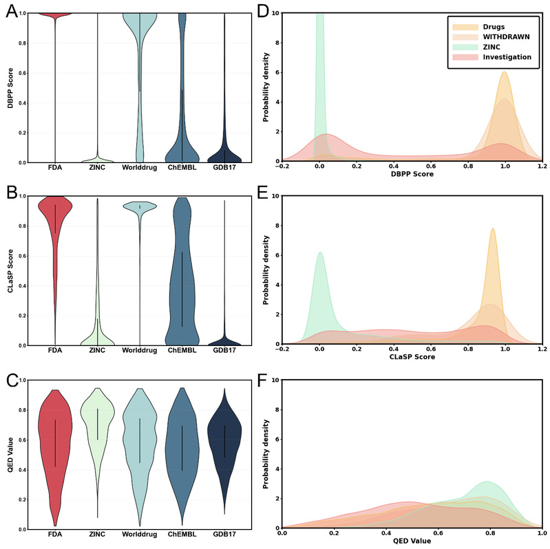 图1:CLVAE(A)、VAE(B)、PCA(C)、T-SNE(D)、UMAP(E)方法类药空间构建对比图 作者在多类数据集上系统评估了CLaSP:以FDA批准药物与其他国家/地区批准药物(Worlddrug)为正例集;以ChEMBL、ZINC(可购买化合物数据库)和GDB17(虚拟化学空间)为对照库;并引入WITHDRAWN(已撤市药物)与Investigation(在研药物)等真实集合进行外部检验。结果显示,CLaSP能输出可与药物优化流程直接对接的综合评分,在不同数据来源与化学空间上均表现出良好的判别力与适用性,具有较强的应用潜力(图2)。