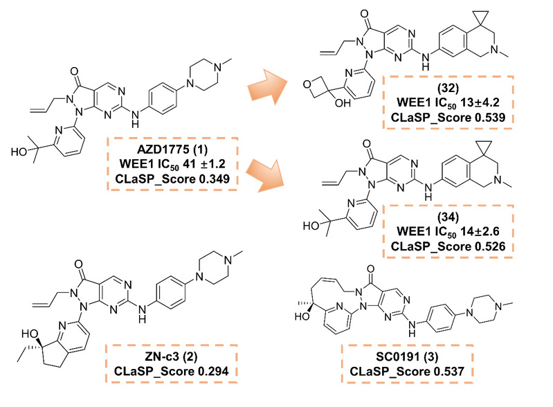 图2:CLaSP、QED、DBPP评分在不同数据集上的表现 为验证评分体系的应用价值,作者针对Wee1抑制剂开展了案例研究:与不良反应事件相关的AZD1775与ZN-c3在CLaSP评分中处于较低水平;相较之下,优化后的化合物32、34以及目前在研的化合物3获得更高评分,显示出良好的优化潜力(图3)。