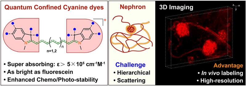 近日,华东理工大学药学院钱旭红院士、杨有军教授团队构建了基于“电场量子限域效应”的超吸收花菁染料。该研究工作提出了一种用于提升染料摩尔消光系数的理性设计方法,对Cy3/5/7/9四个系列的染料进行合理分子改造,成功构建一个摩尔消光系数高(亮度高)、稳定性好的花菁染料库,并成功实现小鼠肾脏组织高精度三维成像。相关成果以“Super-Absorbing Quantum-Confined Cyanine Dyes for Near-Infrared Confocal Imaging of Hierarchical Nephron Structures”为题发表在J. Am. Chem. Soc.(https://doi.org/10.1021/jacs.5c13660)上。