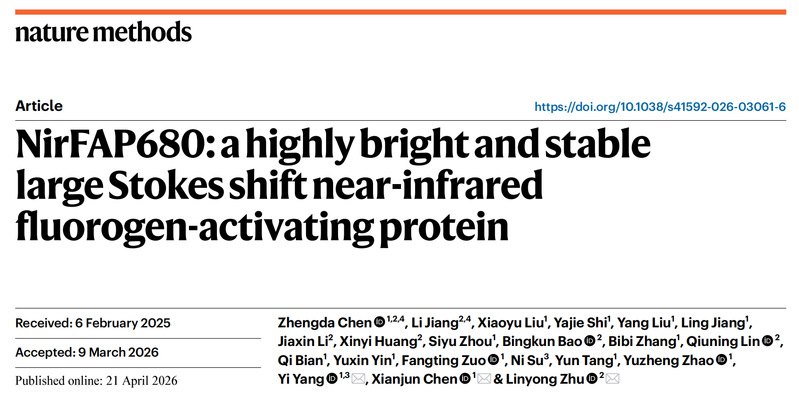 近日,我校药学院、生物反应器工程国家重点实验室及校光遗传学与合成生物学交叉学科研究中心杨弋、陈显军教授及上海交通大学朱麟勇教授组成的研究团队在近红外荧光蛋白成像技术领域取得突破性进展,在国际方法学权威学术期刊《自然—方法》(Nature Methods)以长篇论文(Article)形式在线发表题为“NirFAP680: A Highly Bright and Stable Large Stokes Shift Near-Infrared Fluorogen-Activating Protein”的研究文章。